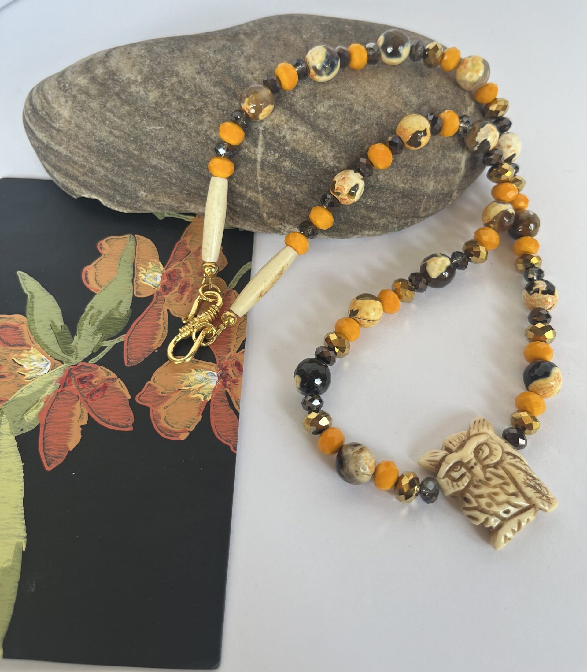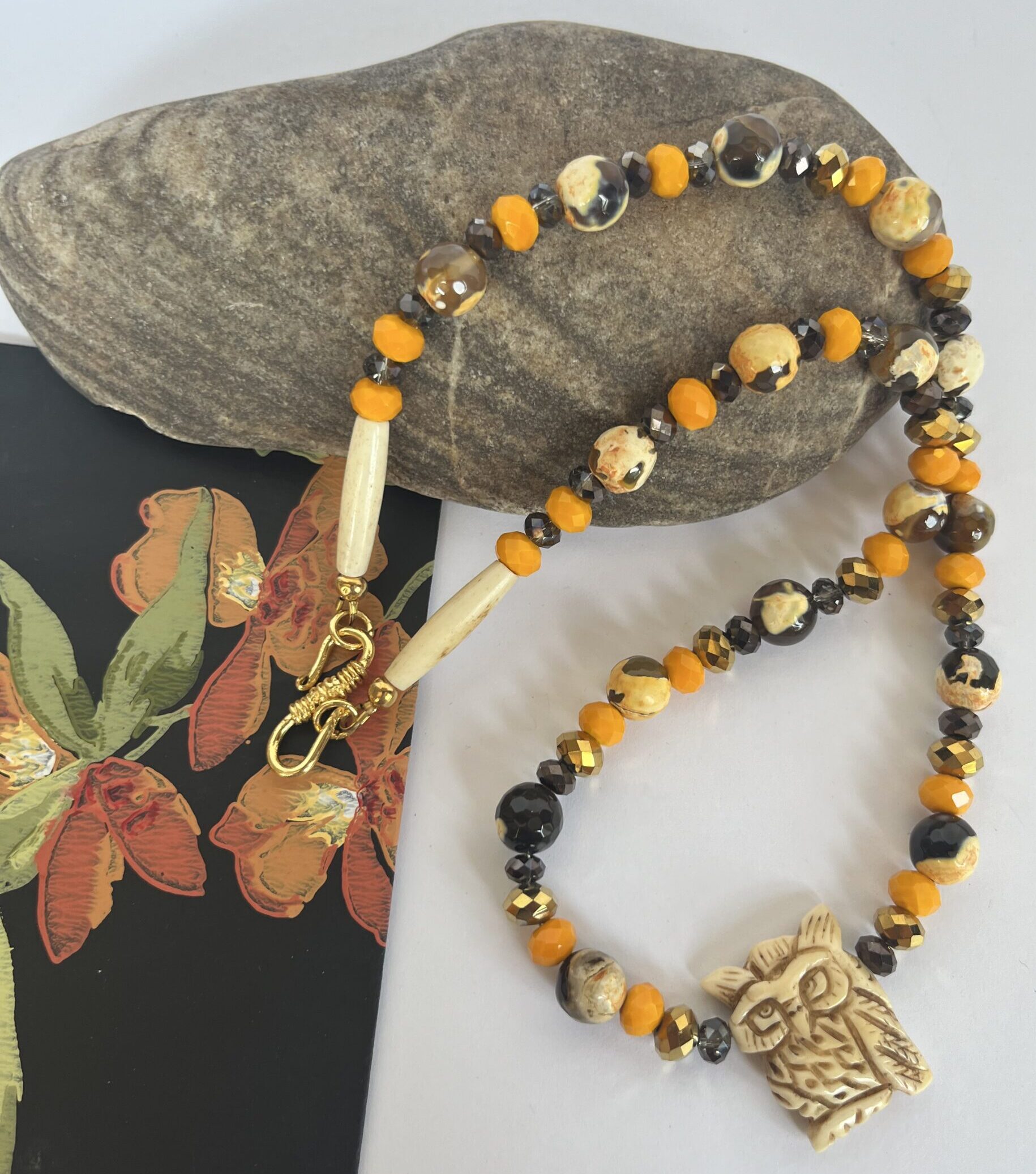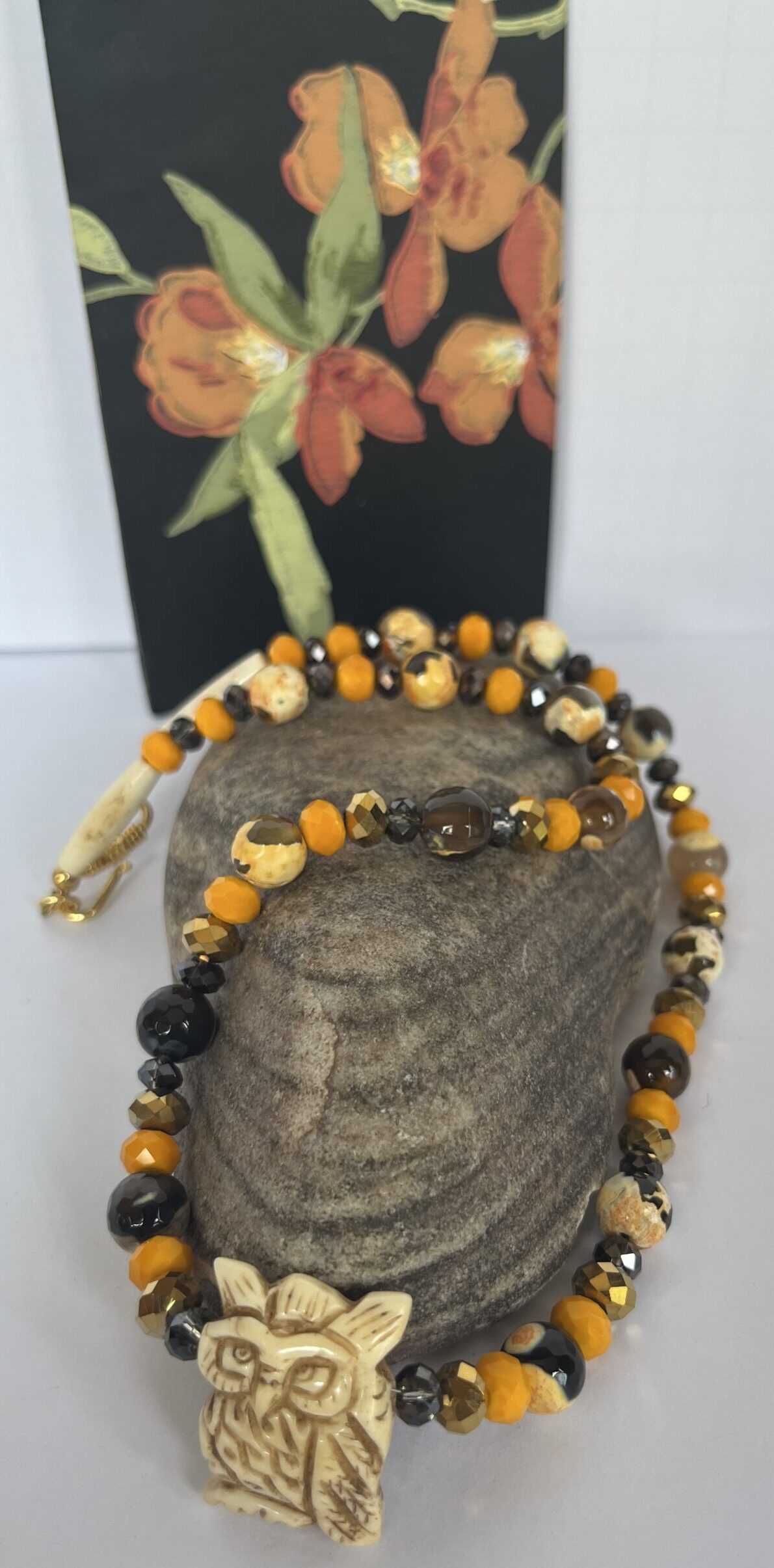 This beautiful necklace features a carved bone owl focal with bumble bee jasper beads and czech glass spacers.