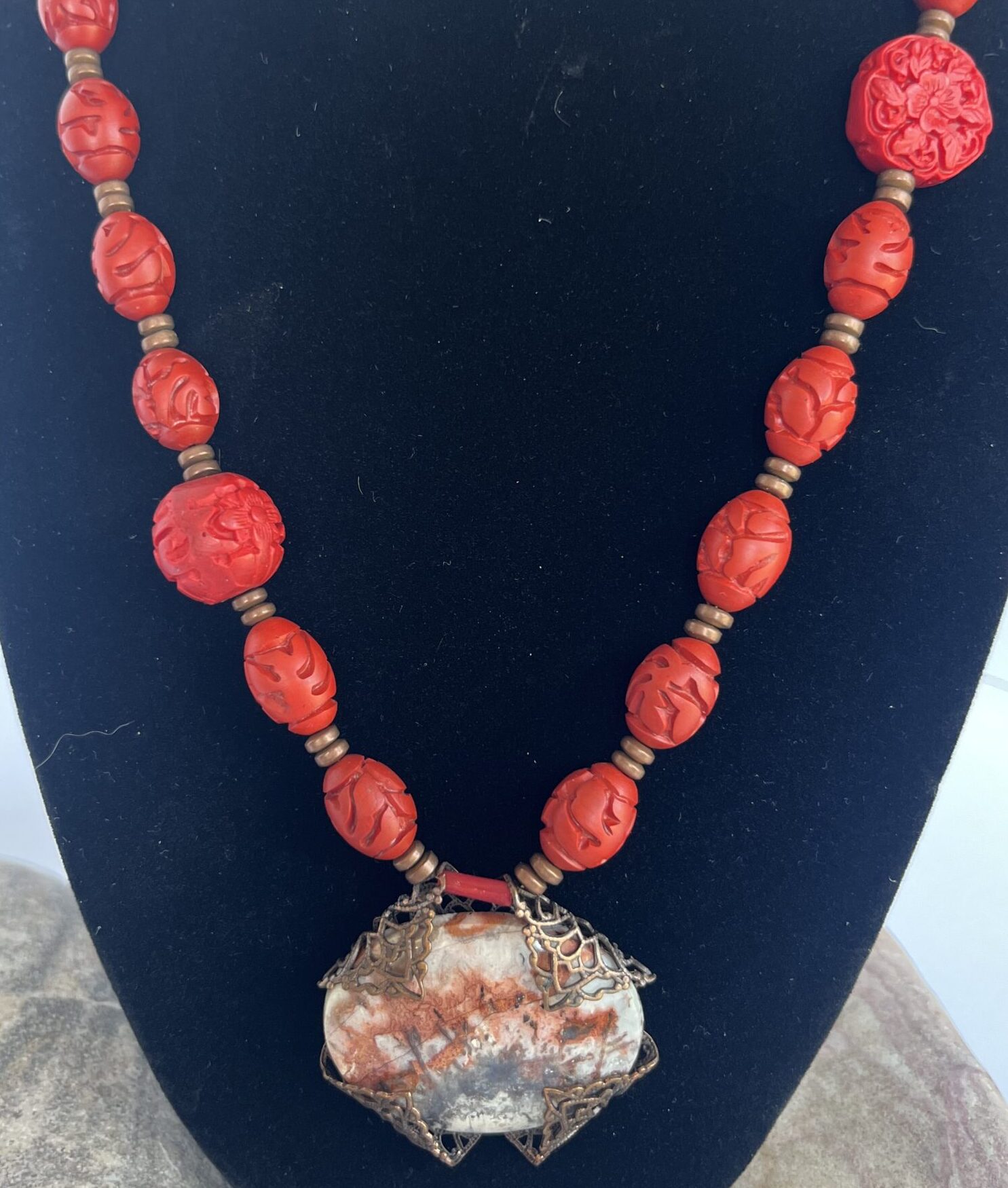 Red and Gray focal stone cabachon with antique cinnabar and red coral beads with copper spacers.